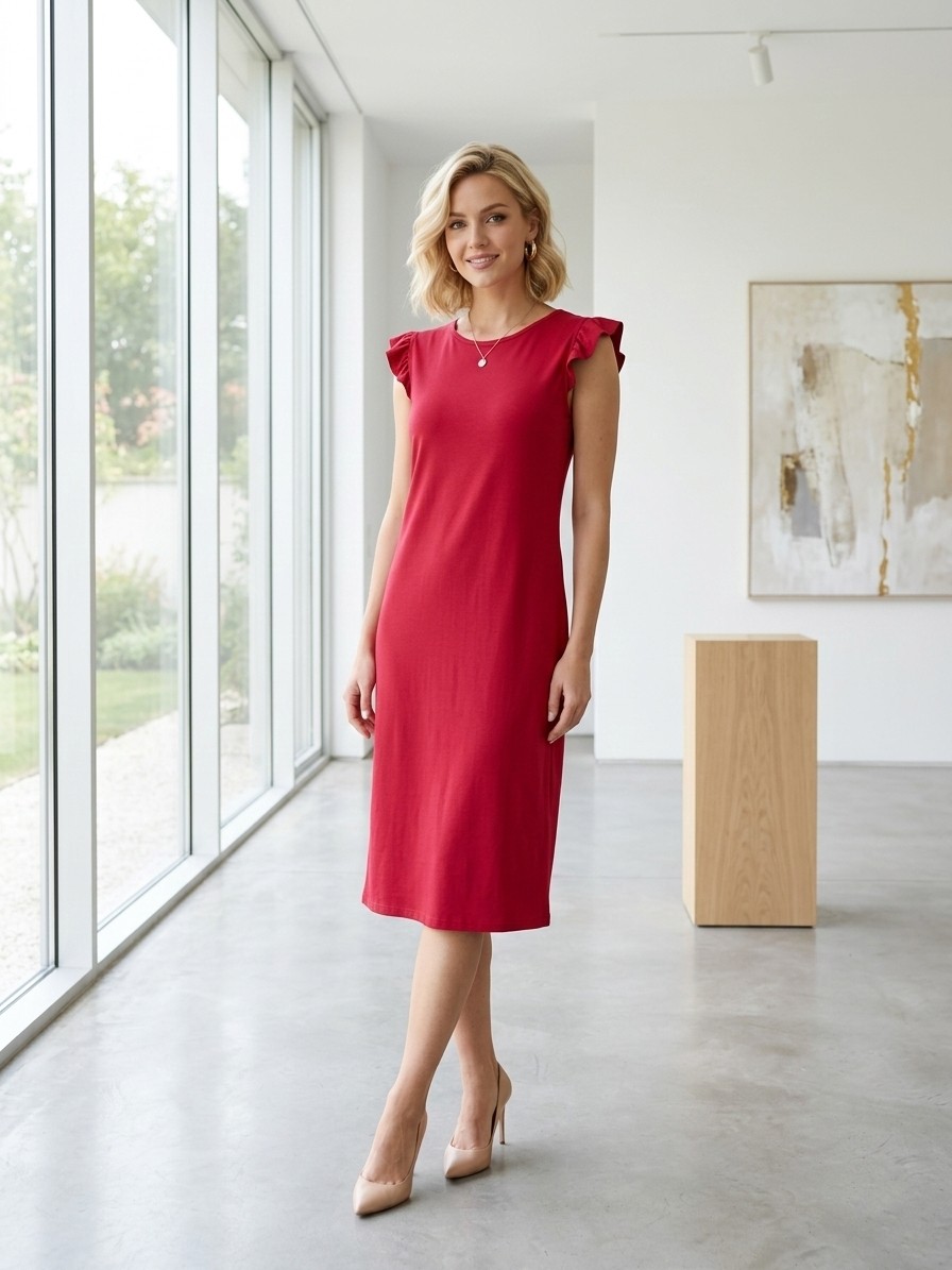 Червена рокля от трико с накъдрен ръкав